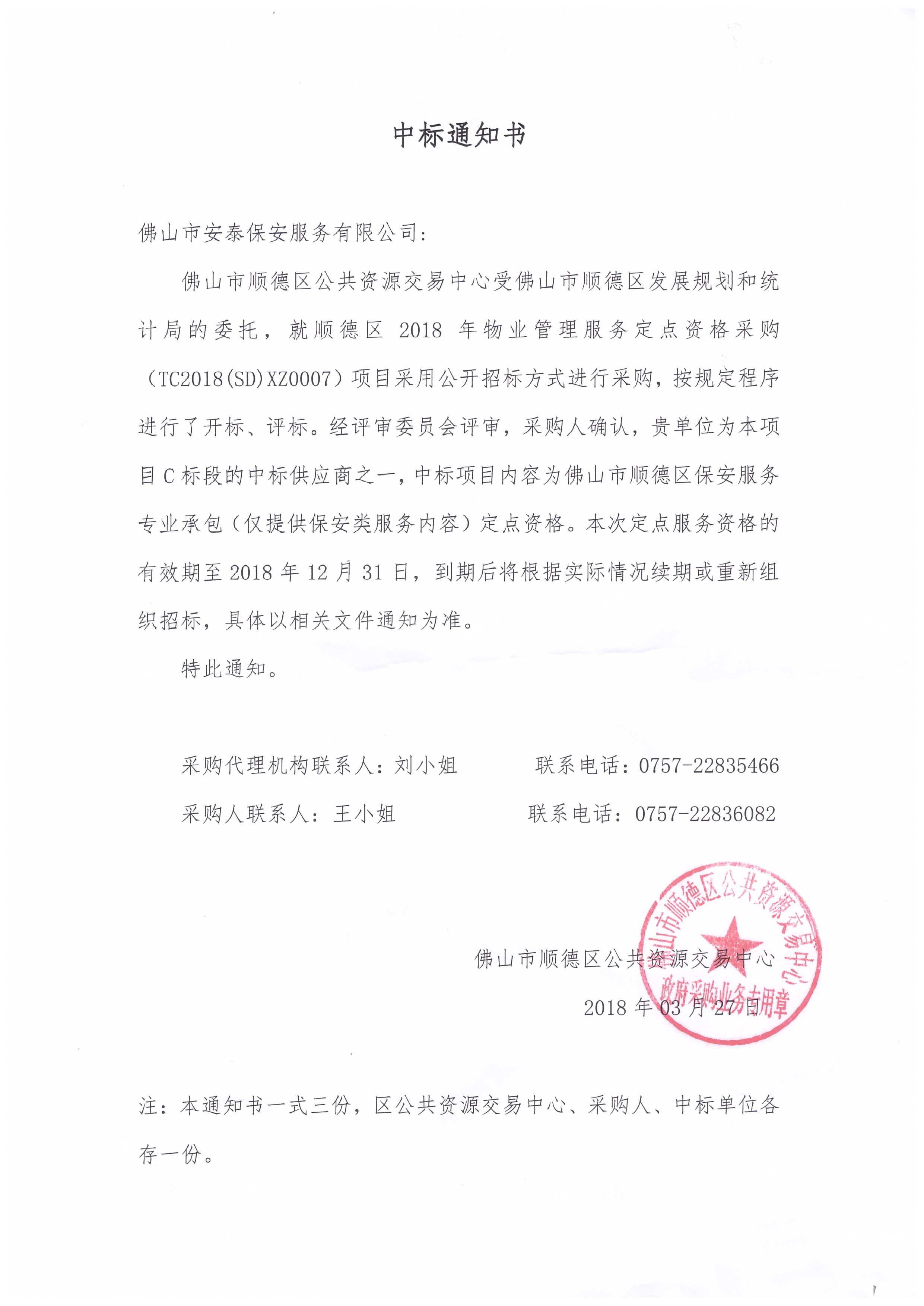 佛山市顺德区2018年物业管理定点保安服务中标通知书